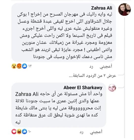 وكانت الفنانة المعتزلة ردت في وقت سابق على إحدى المتابعين عن رأيها الذي كتبته عن تأجيل دورة مهرجان الجونة المقبلة، عن أعمال المسرح الخاصة بالوالدها المخرج الراحل جلال الشرقاوي، قامت الفنانة المعتزلة عبير الشرقاوي، بالتبرأ من أعمال والدها، وكتبت قائلة: "أنا مش مسئولة عن أي حاجة عملها وعمري ما دعمت الجماعات المتطرفة أو غلطت في جنود بلادنا".